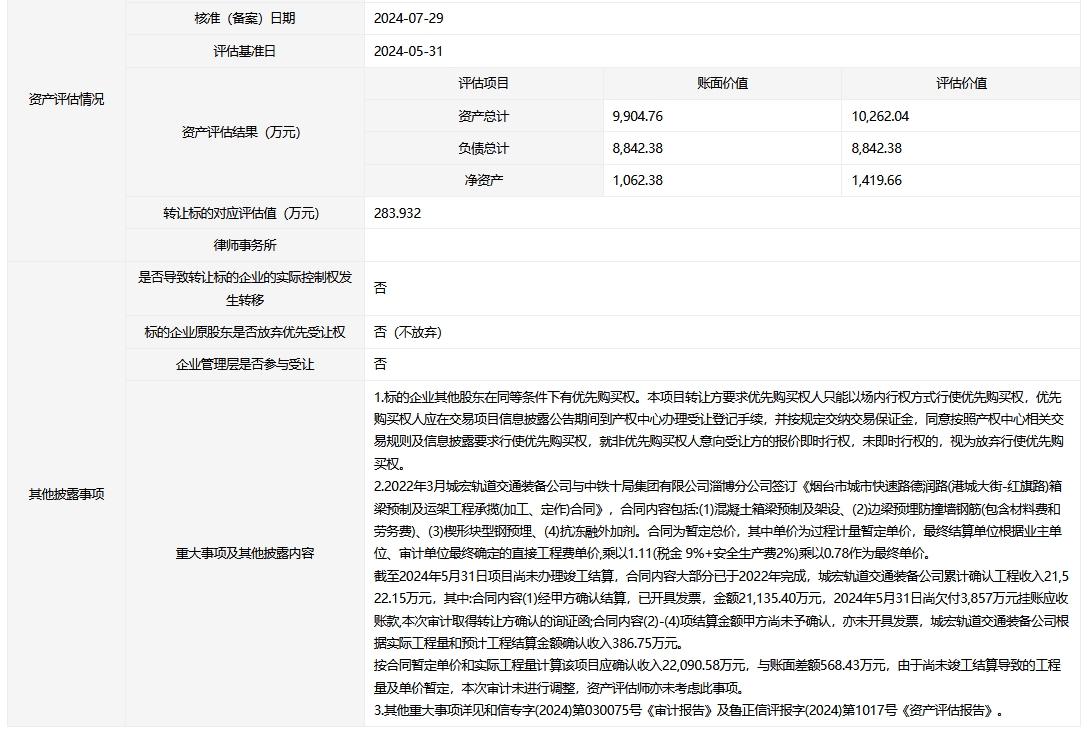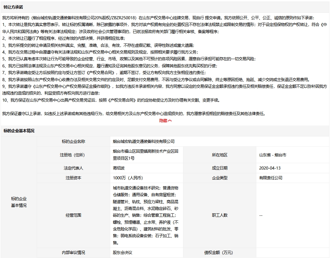 煙臺城宏軌道交通裝備科技有限公司20%股權