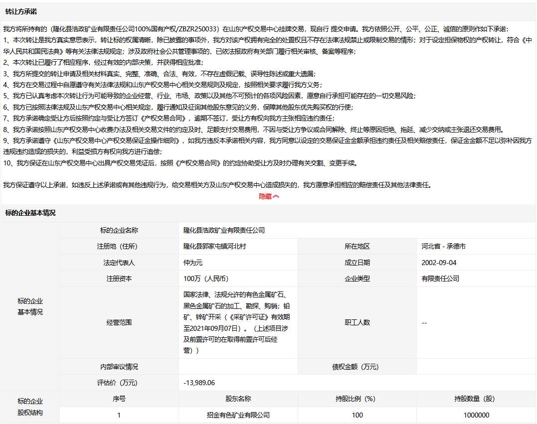 隆化縣浩政礦業(yè)有限責(zé)任公司100%國(guó)有產(chǎn)權(quán)