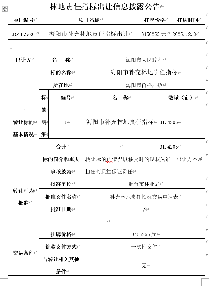 海陽(yáng)市補(bǔ)充林地責(zé)任指標(biāo)出讓
