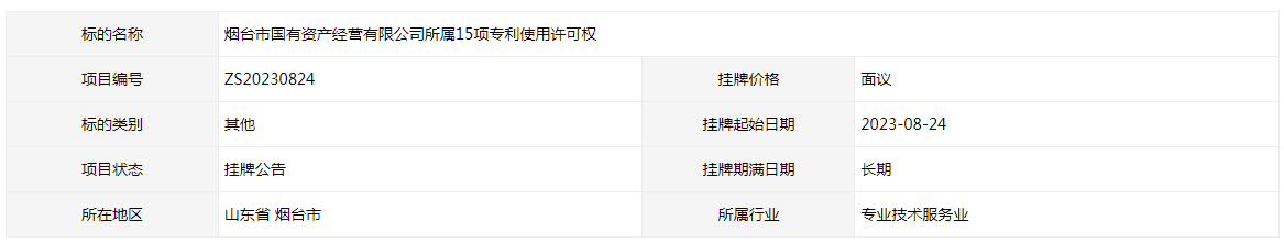 煙臺市國有資產(chǎn)經(jīng)營有限公司所屬15項(xiàng)專利使用許可權(quán)